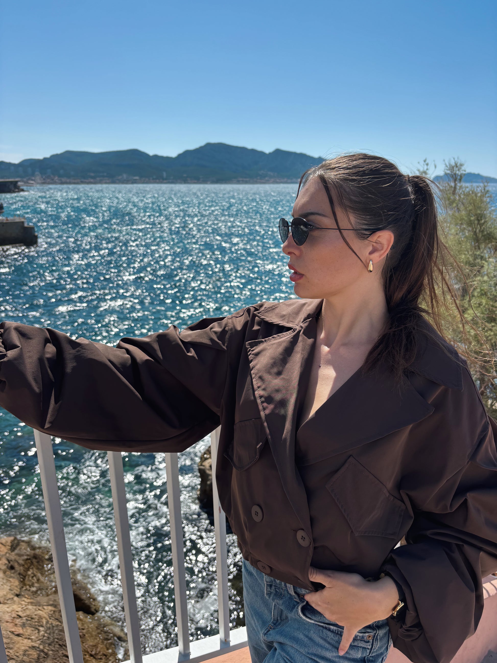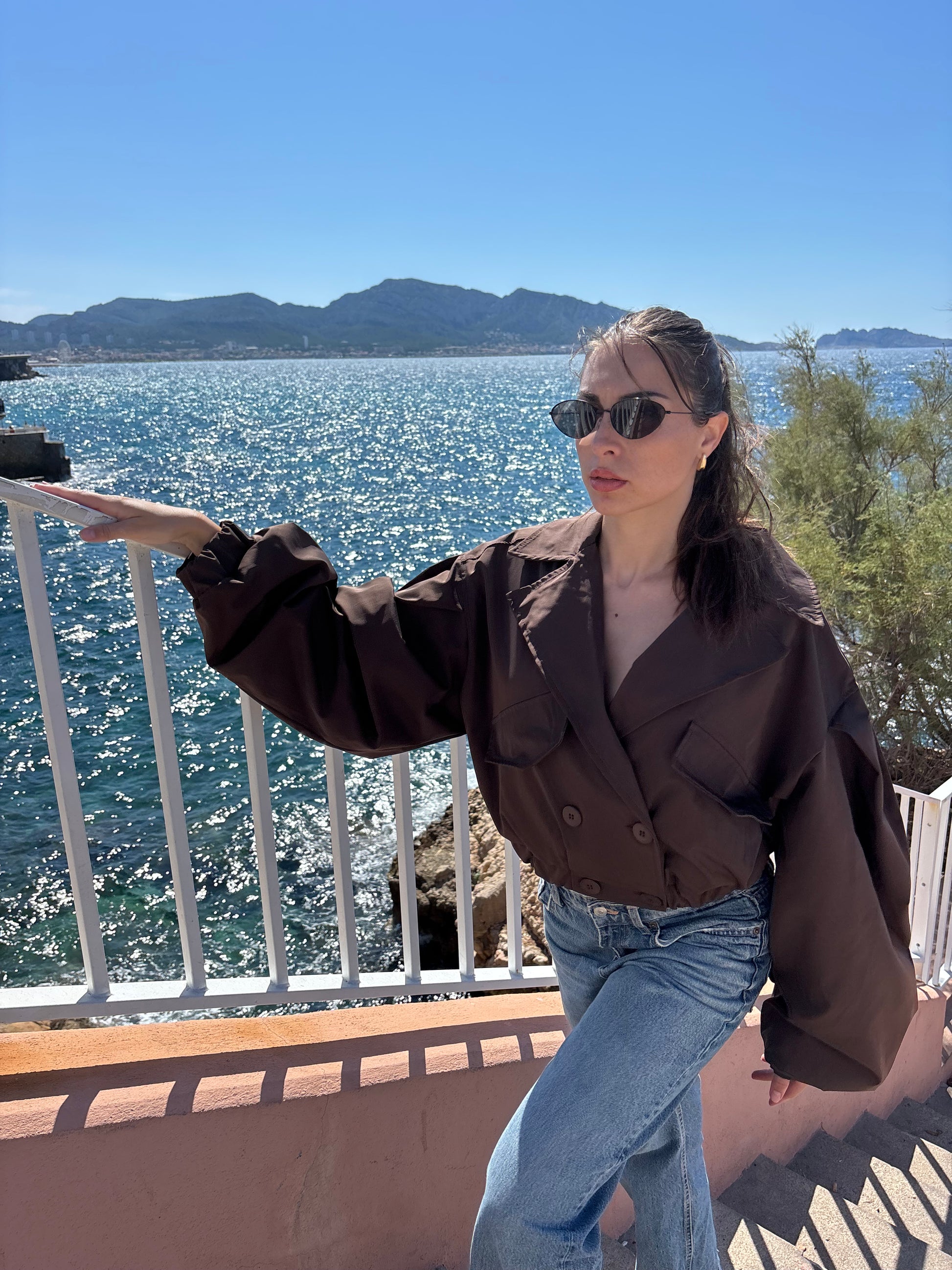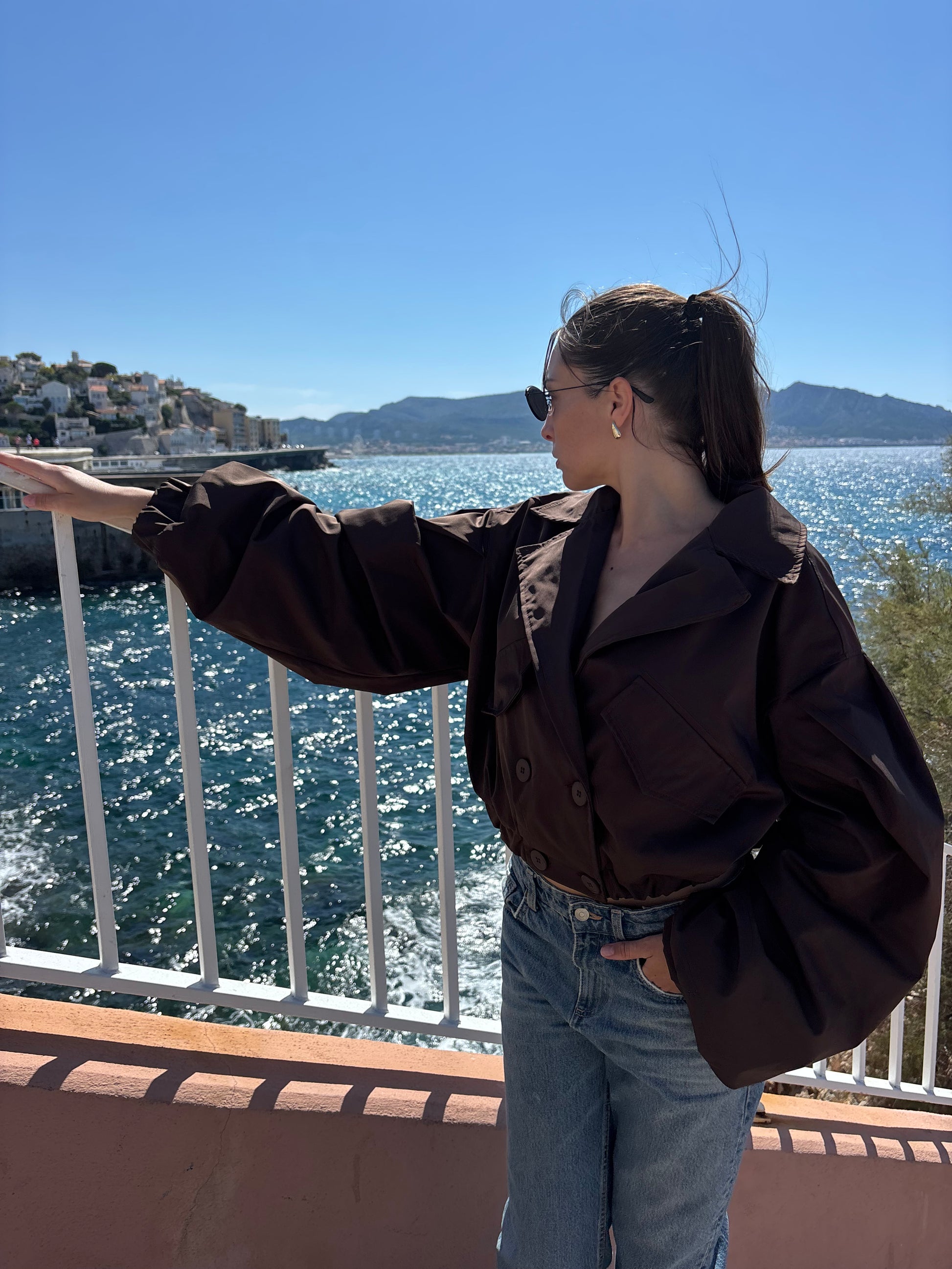 La Veste LEANA est la revisite moderne du trench. Sa coupe courte et oversize, associée à ses manches bouffantes resserrées, lui donne une allure à la fois tendance et élégante. Avec sa couleur marron intemporelle et ses détails soignés, elle devient une pièce forte de votre garde-robe.